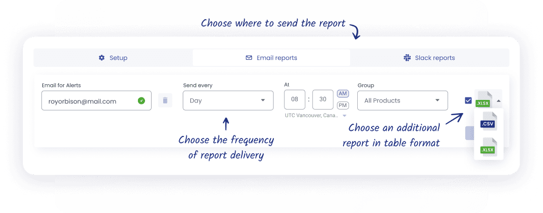 Receive Amazon alerts directly via email or Slack, with the option to generate detailed daily or weekly reports in CSV or XLSX formats. Tailor reports using filters and dates to get the insights that matter most to you.
