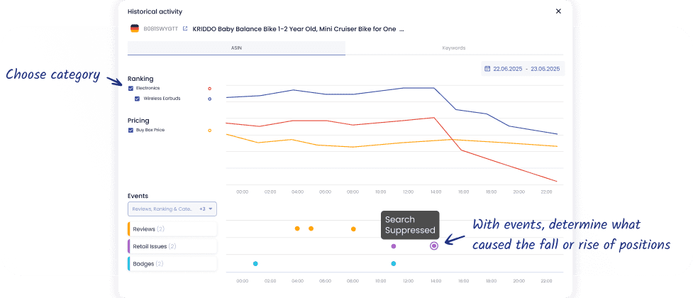Track your product performance with intuitive historical activity graphs. See event data displayed as dots categorized by type (e.g., reviews, rankings), enabling you to analyze trends and understand the impact on your listings.