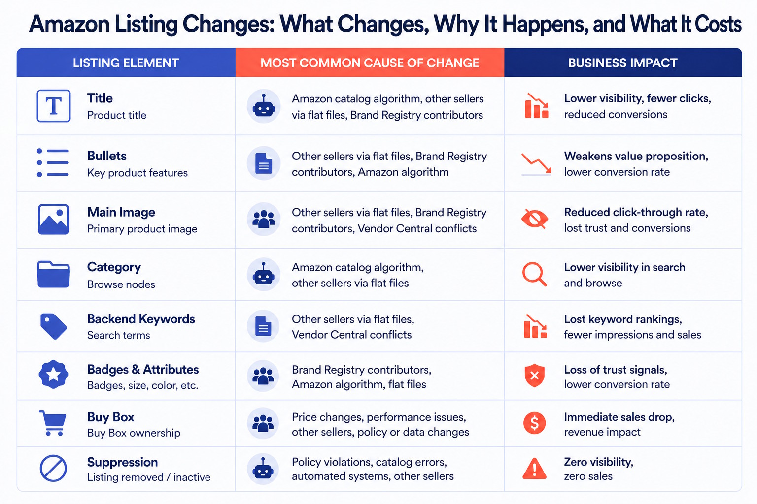 Here’s the thing most sellers don’t know until it costs them: you are not the only party who can change your Amazon listing.