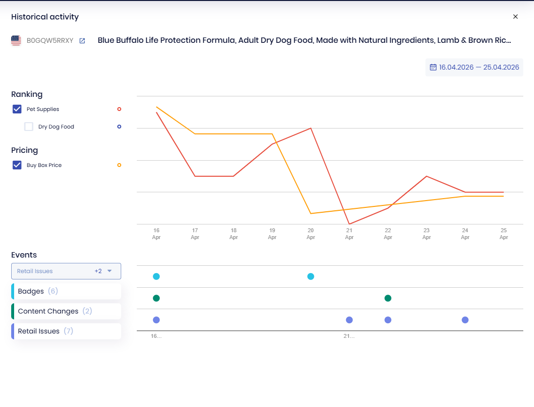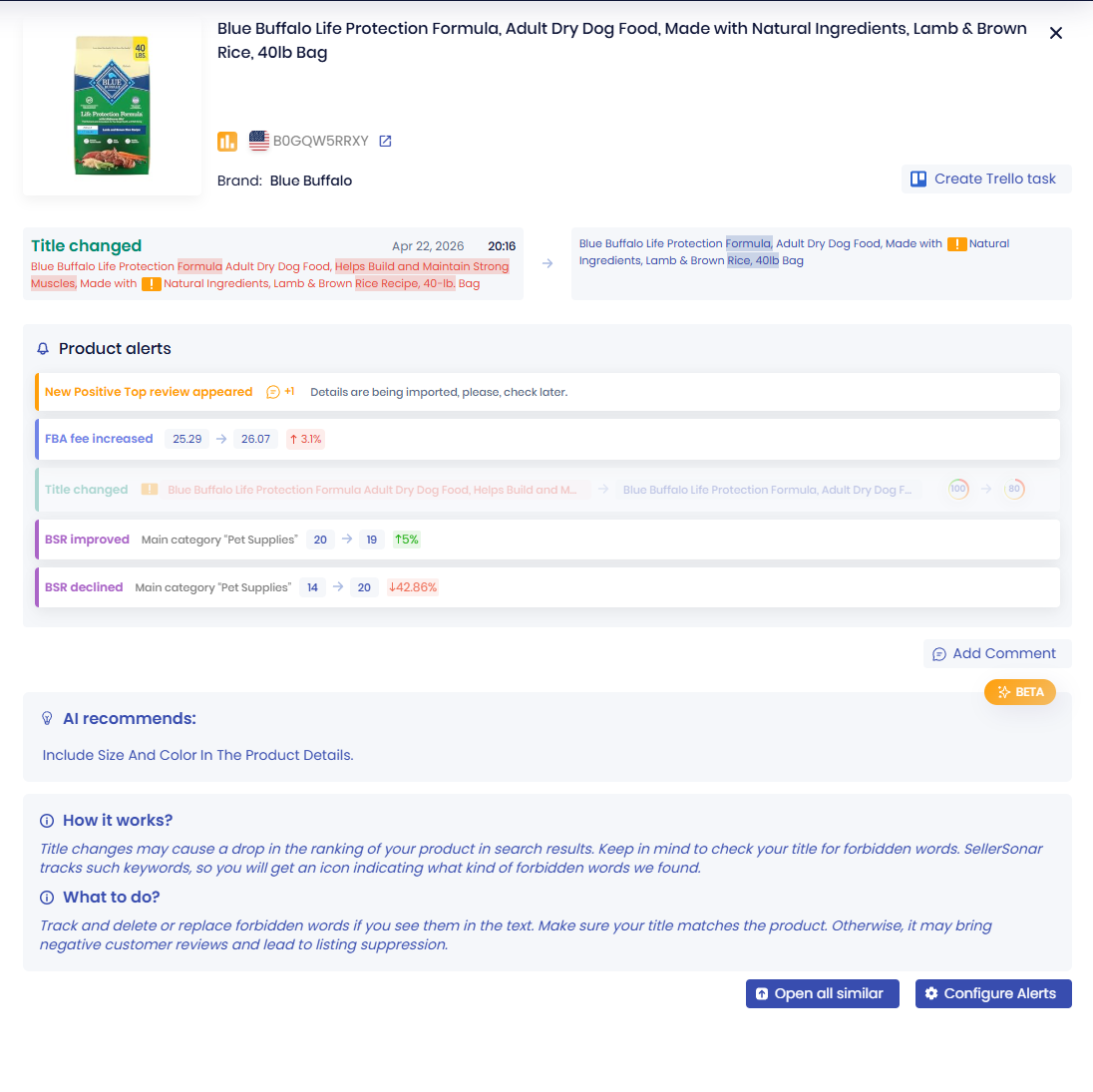 Change history. When did the title change? What did it say before? What does it say now? Your monitoring tool needs to store historical snapshots so you have documentation if you need to escalate with Amazon or Brand Registry.