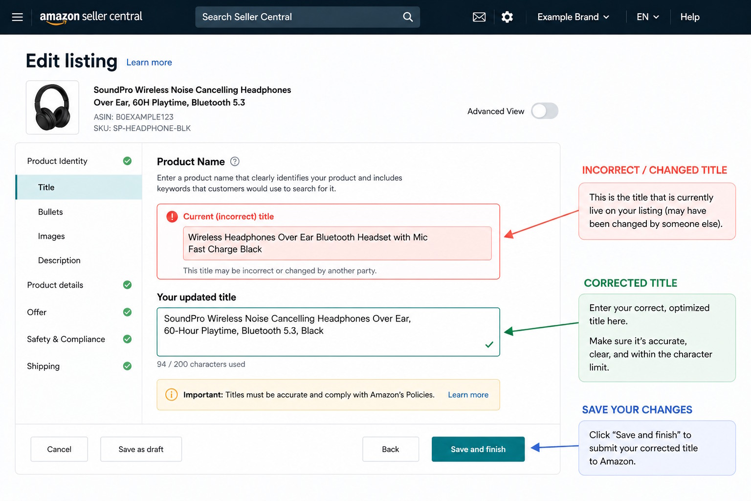 Title or bullet point changed: Go to Seller Central, open Manage Inventory, find the affected ASIN, and click Edit. Update the title or bullets to your correct version and save.