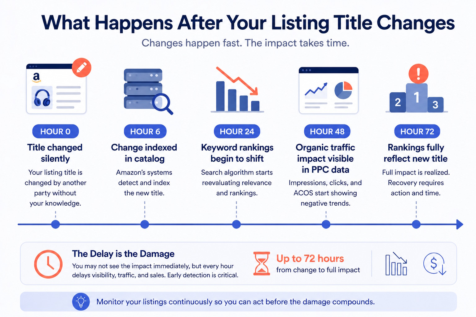 Here’s the timing problem. Title and description changes take 24-48 hours to propagate fully through Amazon’s index. So if your title changes at midnight Thursday, you won’t see the ranking impact until Friday or Saturday. By the time you notice something is wrong, you’ve already lost two days of indexing for your primary keywords.
