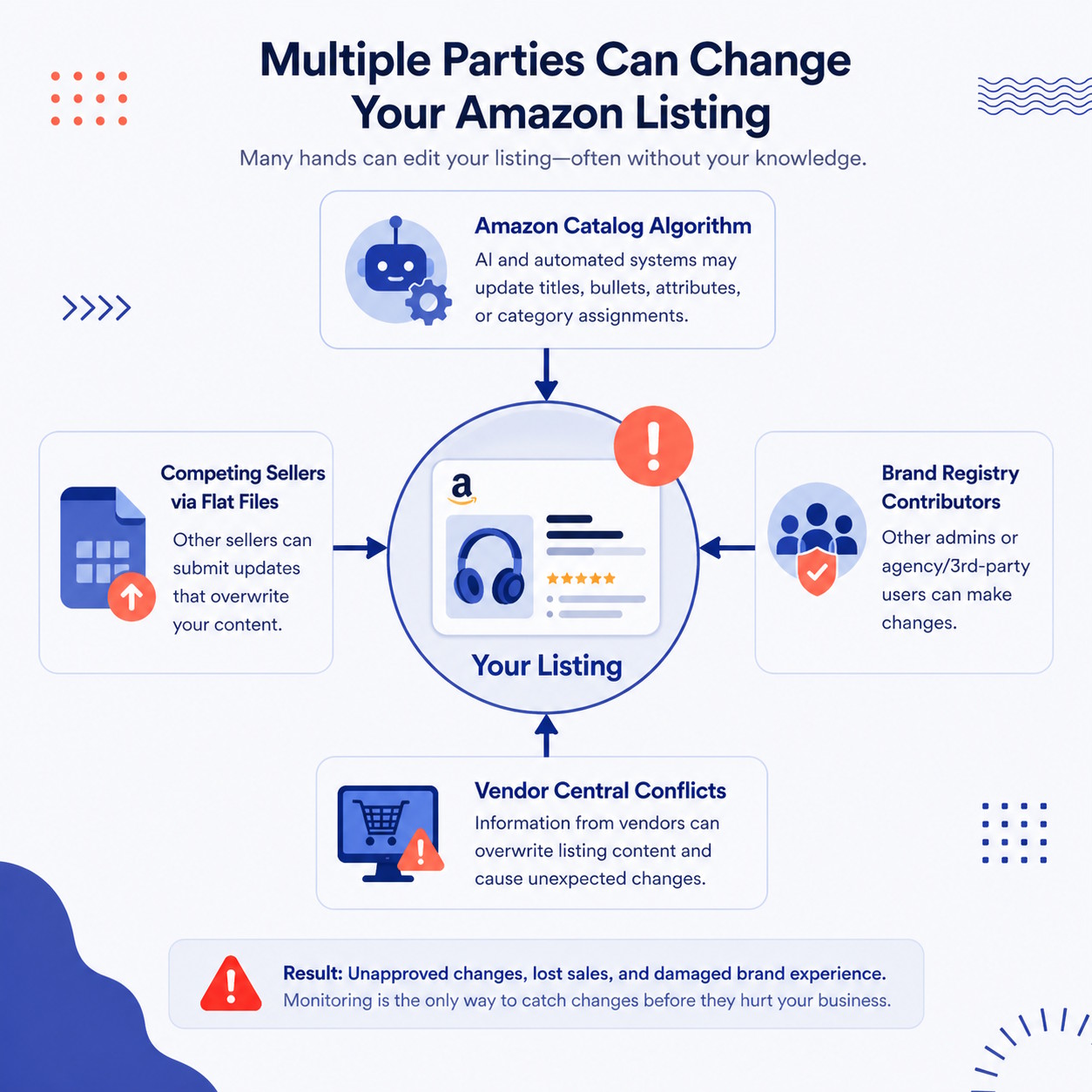 Amazon’s catalog is a shared database. Multiple sellers can submit data on the same ASIN. Brand Registry contributors can push updates. And Amazon itself has processes that “correct” listing content based on its own categorization logic.
