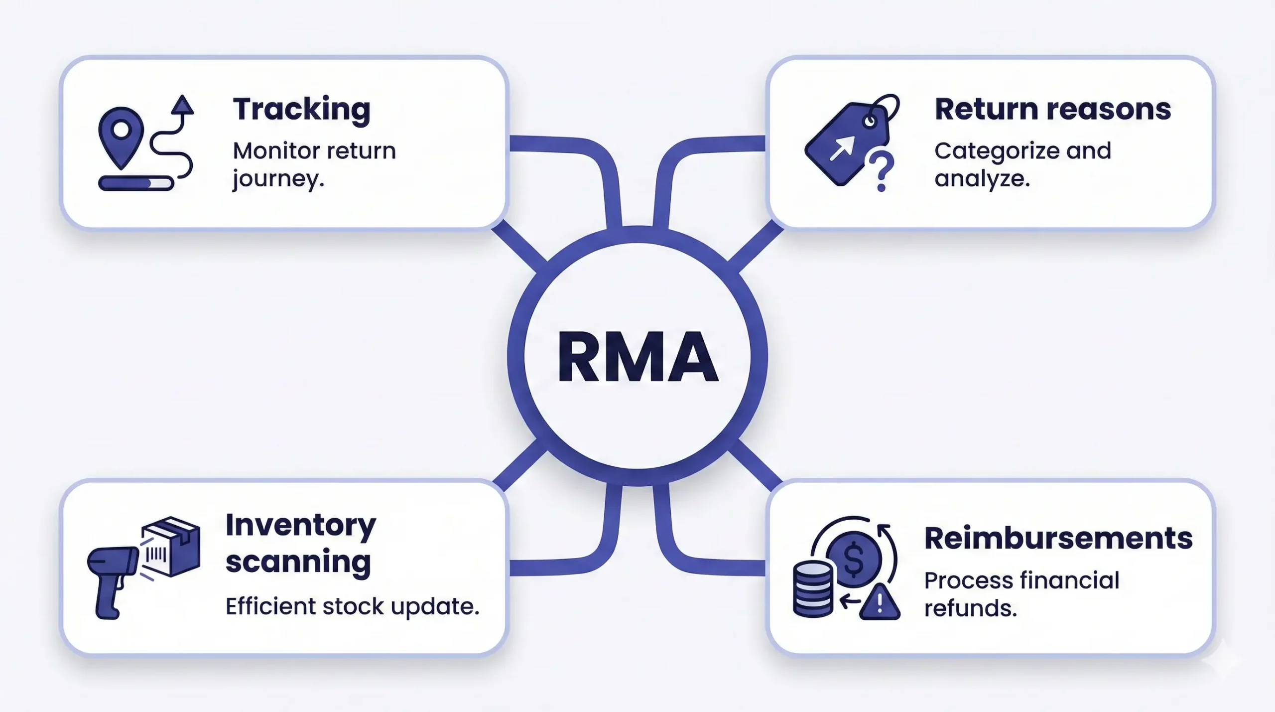 This graphic shows how a complete RMA system covers four areas: monitoring the return journey, analysing why items are returned, scanning inventory and handling refunds, to manage product returns efficiently.