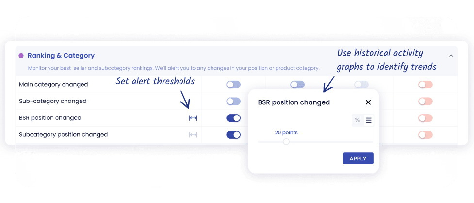 Sei der Erste, der erfährt, wenn sich der Rang deines Produkts verschiebt oder seine Kategorie ändert. Definiere Benachrichtigungsschwellen, um auf signifikante Änderungen zu fokussieren und über die Leistungen deiner Konkurrenten informiert zu bleiben.