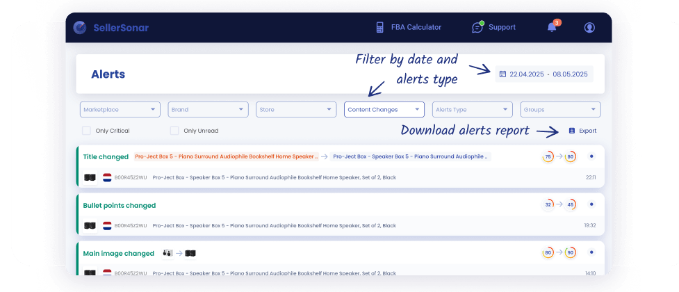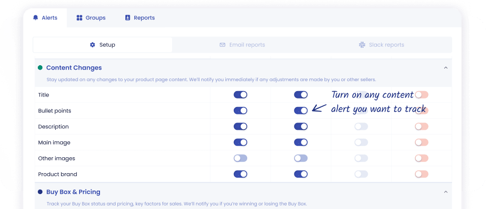 Maintenez l'identité de votre marque sur Amazon avec des alertes pour les changements de contenu critiques. Des mises à jour de titre aux images ou descriptions modifiées, assurez-vous que vos annonces sont conformes aux normes d'Amazon et restent protégées.
