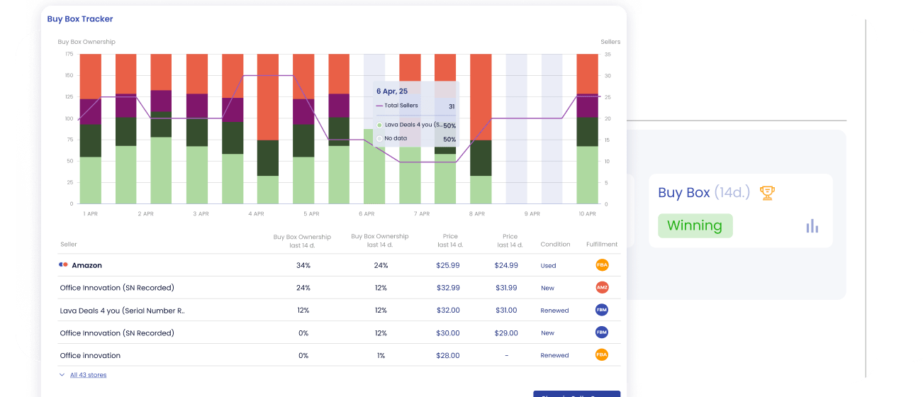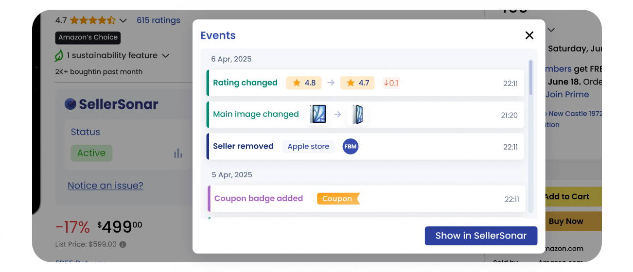 Oubliez les tableaux de bord. Accédez instantanément à la santé des annonces en temps réel, à l'historique du Buy Box et aux alertes critiques directement sur n'importe quelle page produit Amazon.