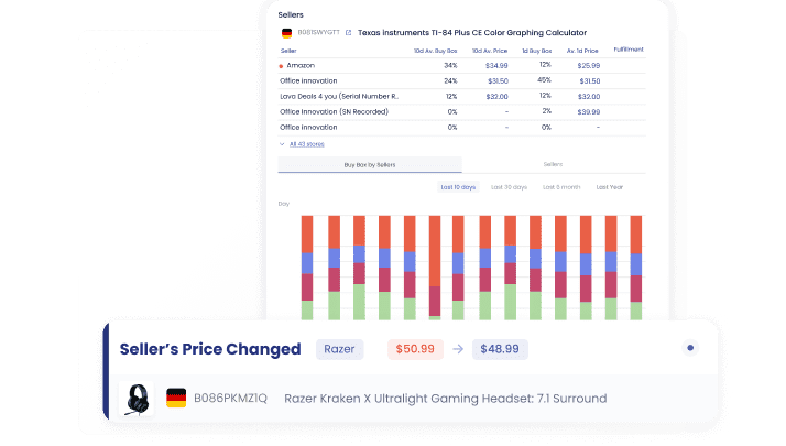 Buy Box स्थिति का पता लगाएं, हाइजैकर्स, प्रतिस्पर्धी गतिविधि और सूची परिवर्तनों पर अधिसूचनाएं प्राप्त करें, कीवर्ड रैंकिंग डेटा निर्यात करें ताकि अपनी बिक्री रणनीति में सुधार करें।