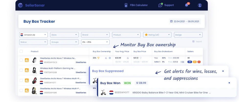 Rekabetçi avantajınızı korumak için Buy Box kazanımlarını, kayıplarını ve baskınlamalarını izleyin. SellerSonar'ın Amazon FBA izleyici, fiyatlama stratejilerinizi iyileştirmenize ve satış fırsatlarını maksimize etmenize yardımcı detaylı analitikler sunar.