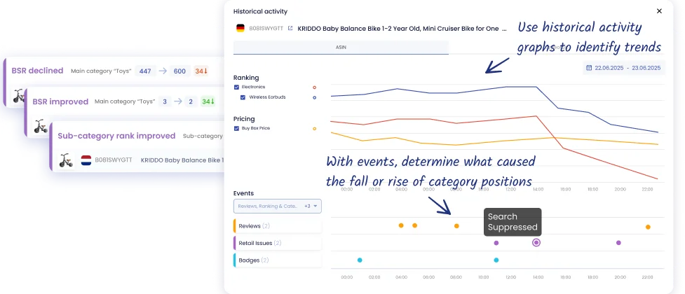 Bilgilendirin BSR düşüşleri ve kategori değişiklikleri hakkında. Trenleri tespit etmek, kategori pozisyon değişikliklerinin nedenlerini açığa çıkarmak ve ürün performansını artırmak için veri odaklı kararlar almak için tarihsel aktivite grafiklerini ve olayları kullanın.