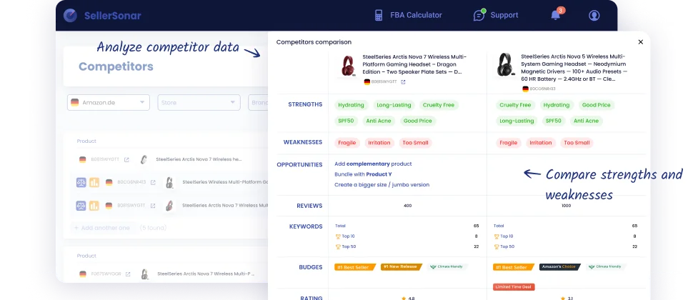 SellerSonar’nın rakip izleme araçlarıyla rakip listelerini, fiyat eğilimlerini ve BSR değişimlerini takip edin. Eylem odaklı öngörülerle strateginizi uygun hale getirin ve piyasada önde kalın.