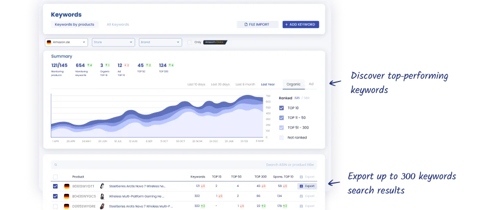 Keşfedin en iyi performans gösteren anahtar kelimeleri Amazon anahtar kelime takipçileri. Ses payını, derecelendirme tarihini ve anahtar kelime performansını analiz ederek SEO strateginizi geliştirin ve görünürlüğü artırın.